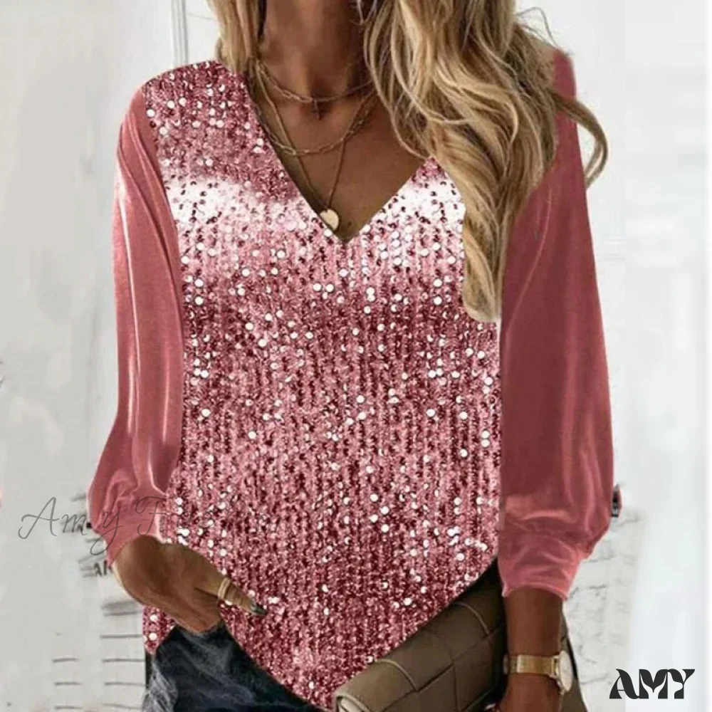 Amy Fashion - Casual V-neck Shiny Sequin Patchwork Loose Party Club Pullover