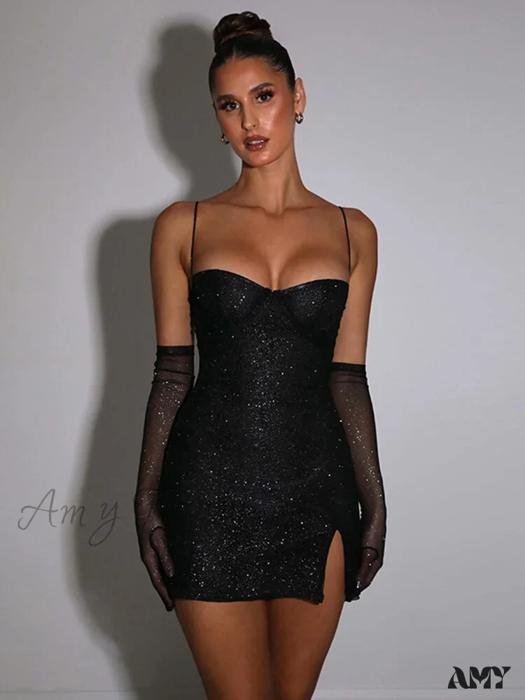Amy Fashion - Glitter Party Club Fashion Outfits Spaghetti Strap Sexy Slit Dress