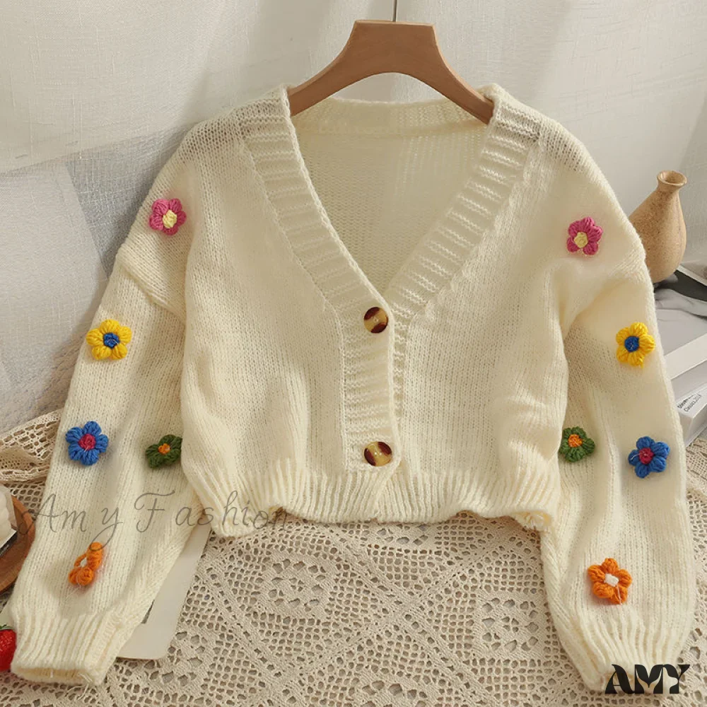 Amy Fashion - Flower V-neck Kawaii Retro Design All-match Mujer Cardigans