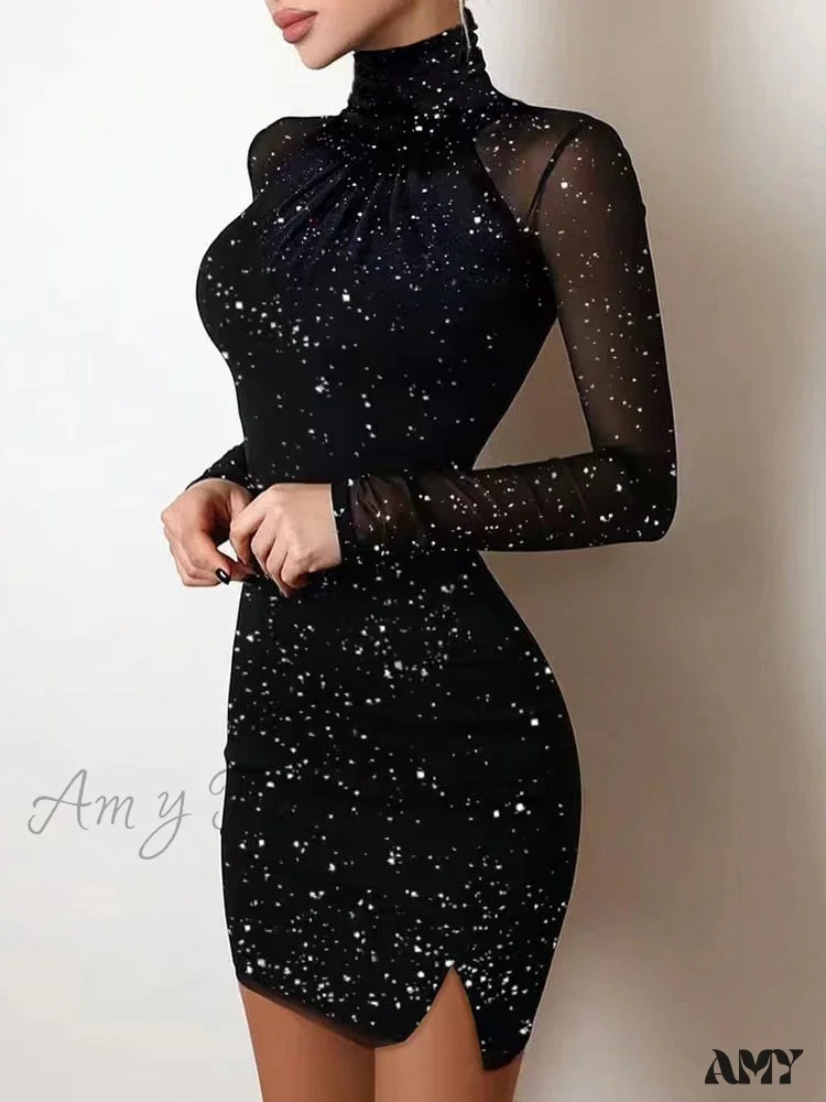 Amy Fashion - Mesh Transparent Shiny Print Turtleneck Long Sleeve Dress