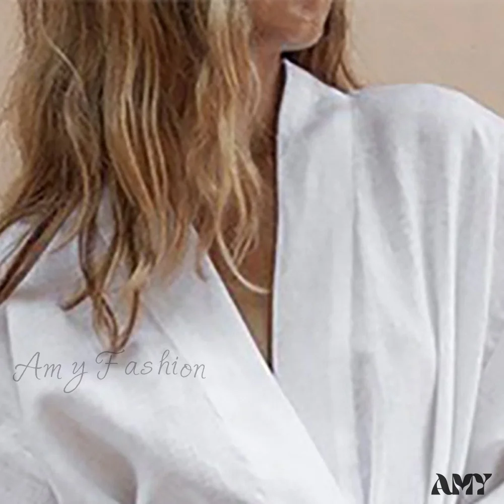Amy Fashion - V-Neck Kimono Cotton Linen Long Sleeve Sashes Dresses